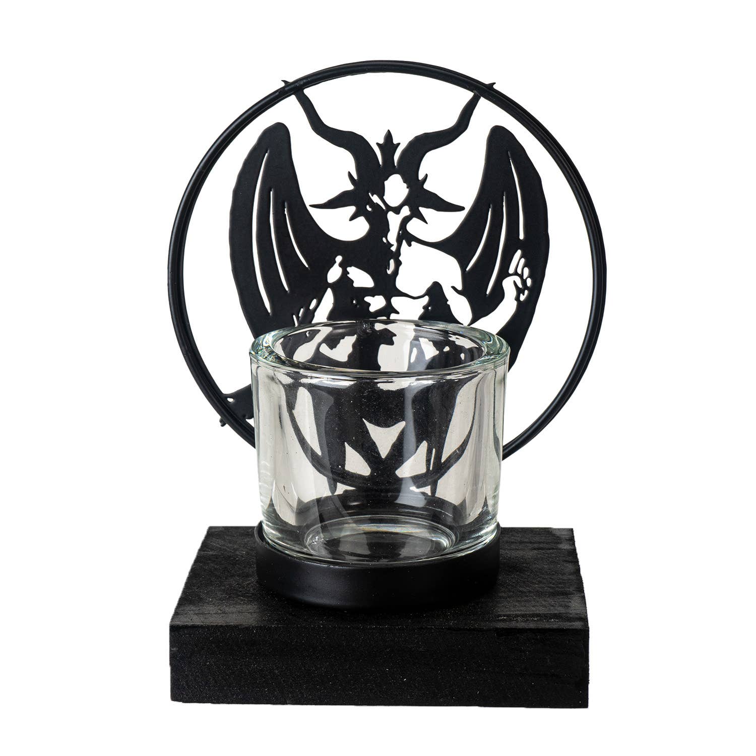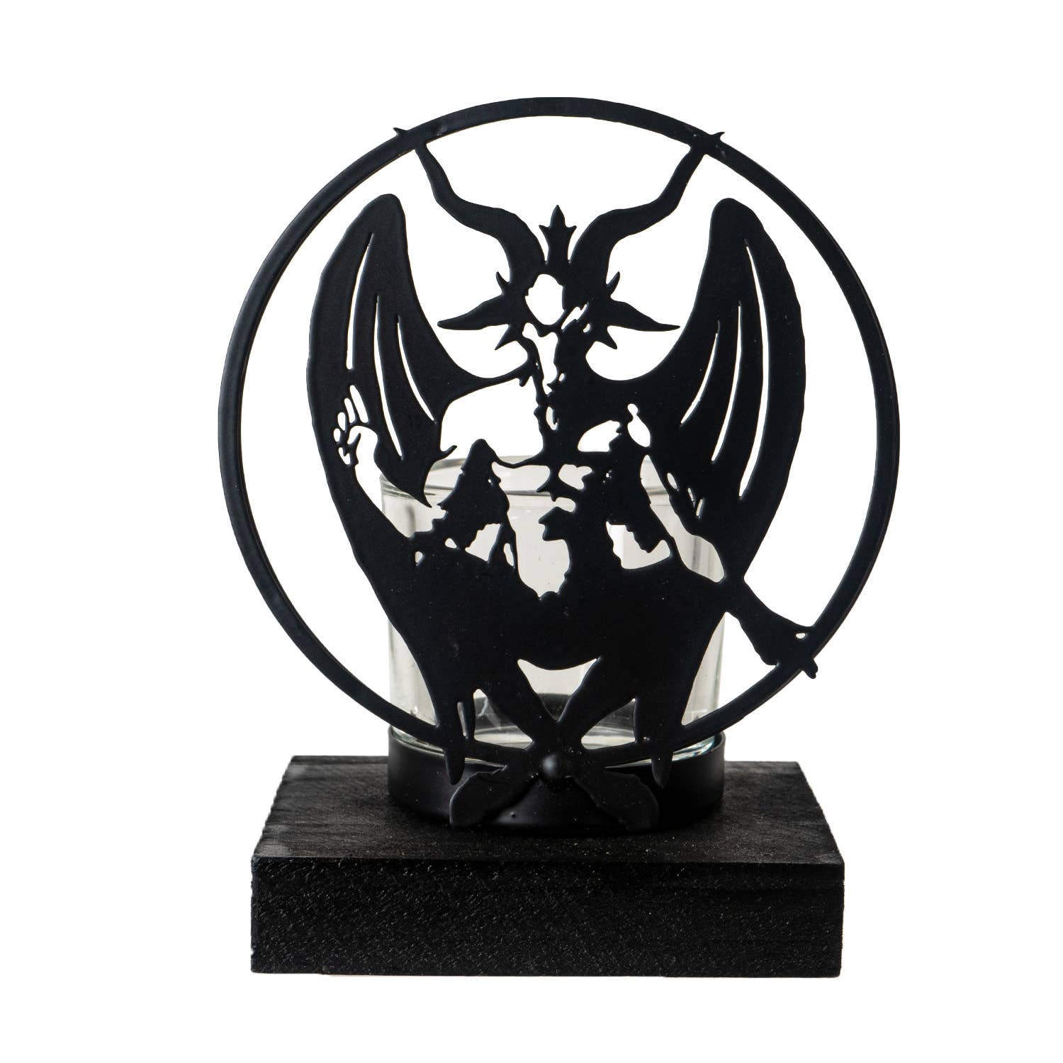 This Personal Baphomet Tealight Holder, meticulously designed with a sleek powder-coated metal and wood base, stands at 5.75 inches. Its dimensions of 4.5" x 3.12" x 5.75" offer a stylish and unique way to display your favorite candles. Add a touch of elegance to your decor with this robust and exquisite candle holder.